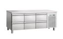 De koelwerkbanken van Bartscher zijn van de hoogste kwaliteit. Deze geforceerde koelwerkbank is ideaal voor horeca met een kleine keuken., met eenvoudig te reinigen werkblad. FCKW-vrij, 6 lades. 1 /1 GN, 100 mm diep