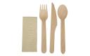 Dit individueel verpakte 4-delige houten maaltijdpakket bevat een houten wegwerpmes, vork en lepel met een natuurlijk ongebleekt papieren servet. Het gebruikte hout is duurzaam berkenhout, vervaardigd uit kwaliteitshout van klasse A. De verpakking is gemaakt van natuurlijk kraftpapier zonder plastic inhoud.