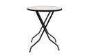 Inklapbare grijze statafel met onderbeugel. Het blad, voorzien van stootrand, is hitte- en weerbestendig en krasvast. Stevig grijs buizen onderstel, hoog 110 cm.