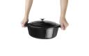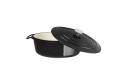 Traditionele, gietijzeren, ovale braadpan met handgrepen aan de zijkanten en een RVS knop op het deksel. Deze pan heeft zeer goede warmhoudeigenschappen en zorgt voor een gelijkmatige warmteverdeling. Deze mooie, zwarte pan is ideaal om vanuit de oven rechtstreeks te serveren aan tafel, voor een mooie presentatie van het gerecht. De deksel heeft een innovatieve vorm waardoor vocht terug in de pan druipt.