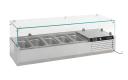 De gekoelde opzetvitrine is voor het bewaren van ingrediënten in gastronormbakken. Dit is bijvoorbeeld handig voor horecaondernemers die zich bezighouden met het verkopen van etenswaren als belegde broodjes. Door voor het opslaan en koelen van broodbeleg glazen opzetvitrines te gebruiken, kunnen de gasten in de betreffende horecazaak namelijk direct zien uit welke soorten broodbeleg men kan kiezen bij het kopen van een belegd broodje. De opzetvitrine is standaard voorzien van een glasopstand. De temperatuur is digitaal instelbaar. Wordt geleverd zonder GN-Bakken
