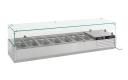 De gekoelde opzetvitrine is voor het bewaren van ingrediënten in gastronormbakken. Dit is bijvoorbeeld handig voor horecaondernemers die zich bezighouden met het verkopen van etenswaren als belegde broodjes. Door voor het opslaan en koelen van broodbeleg glazen opzetvitrines te gebruiken, kunnen de gasten in de betreffende horecazaak namelijk direct zien uit welke soorten broodbeleg men kan kiezen bij het kopen van een belegd broodje. De opzetvitrine is standaard voorzien van een glasopstand. De temperatuur is digitaal instelbaar. Wordt geleverd zonder GN-Bakken