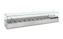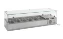 De gekoelde opzetvitrine is voor het bewaren van ingrediënten in gastronormbakken. Dit is bijvoorbeeld handig voor horecaondernemers die zich bezighouden met het verkopen van etenswaren als belegde broodjes. Door voor het opslaan en koelen van broodbeleg glazen opzetvitrines te gebruiken, kunnen de gasten in de betreffende horecazaak namelijk direct zien uit welke soorten broodbeleg men kan kiezen bij het kopen van een belegd broodje. De opzetvitrine is standaard voorzien van een glasopstand. De temperatuur is digitaal instelbaar. Wordt geleverd zonder GN-Bakken