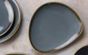 Deze driehoekige blauwe borden uit het Olympia Kiln assortiment hebben het ideale formaat voor voorgerechten en zijn geïnspireerd op de kleuren uit de natuur. Door een reactief glazuur aan te brengen, is elk bord uit dit assortiment uniek. Een mooi porselein om huisgemaakte gerechten te serveren.