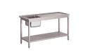 Spoeltafel: 120(b) x 60(d) x 87(h)cm, roestvrijstaal 18/10, met achteropstand en onderplank.