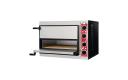 Gastro-M-pizzaoven "Pisa compact" met RVS-front en -deuren. Voorzien van een chamottebodem en per kamer voorzien van thermostaat en tijdklok. Compleet met hoofdschakelaar, controlelampje, binnenverlichting en oververhittingsbeveiliging. Geschikt voor o.a. pizza's van 32(Ø)cm.