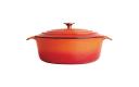 Traditionele, gietijzeren, ovale braadpan met handgrepen aan de zijkanten en een RVS knop op het deksel. Deze pan heeft zeer goede warmhoudeigenschappen en zorgt voor een gelijkmatige warmteverdeling. Deze mooie, oranje pan is ideaal om vanuit de oven rechtstreeks te serveren aan tafel, voor een mooie presentatie van het gerecht. De deksel heeft een innovatieve vorm waardoor vocht terug in de pan druipt.