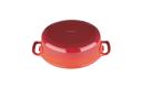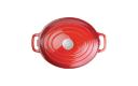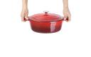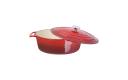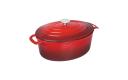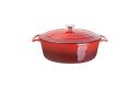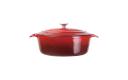 Traditionele, gietijzeren, ovale braadpan met handgrepen aan de zijkanten en een RVS knop op het deksel. Deze pan heeft zeer goede warmhoudeigenschappen en zorgt voor een gelijkmatige warmteverdeling. Deze mooie, rode pan is ideaal om vanuit de oven rechtstreeks te serveren aan tafel, voor een mooie presentatie van het gerecht. Het innovatieve deksel is zelfbedruipend.