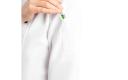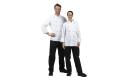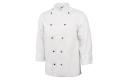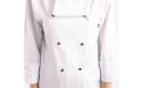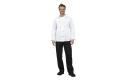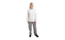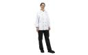 Traditionele en praktische unisex koksbuis voor gebruik in de drukke keuken. Voorzien van afneembare bolknopen voor eenvoudig wassen. Polyester/katoen. Dubbele sluiting. Incl. zwarte bolknopen. Borstzakje. Thermozakje op de linkermouw.