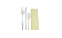 Mes, vork, lepel en servet verpakt in drie verschillende kleuren.
