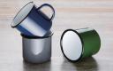 De mokken zijn vervaardigd uit een hoge kwaliteit RVS waarop een zeer duurzame laag gesmolten glas is aangebracht. Hierdoor wordt een zeer glad oppervlak verkregen. Door lang en intensief gebruik krijgt de mok een geheel eigen karakter.