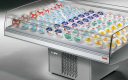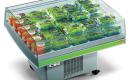 Oscartielle panorama-koeleiland ARCHE XP C-MAX 1270 , geschikt voor voorverpakt fruit, zuivelproducten of delicatessen, decorstrips in wit, onderbouw van grijs gelakt plaatstaal, van verzinkt, slag- en stootvast wit gecoat plaatstaal, voedselveilig.