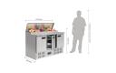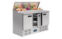 Hoge capaciteit, 3-deurs gekoelde professionele horeca prepareer counter van Polar. Geventileerde koeling met extra koeling voor 8x GN 1/4 bakken (tot 200mm diep). Met o.a. gebruiksvriendlijke bediening, digitaal display, automatische ontdooiing, 3 verstelbare roosters en bodemroosters.