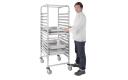 Deze grote GN 2/1 regaalwagen is ideaal voor het stapelen en bewaren van een groot aantal Gastronorm bakken. Er zit 8cm ruimte tussen de etages en hij heeft vier wielen voor eenvoudig manoeuvreren. De regaalwagen is ook voorzien van vier bumpers en twee remmen zodat zware ladingen geen probleem vormen.