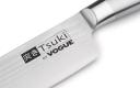 Snij moeiteloos stukken vlees met dit santokumes van Vogue Tsuki. Het mes is vakkundig gemaakt, met een Japanse VG-10-RVS-kern met een hardheid van Rockwell 60 waardoor het mes zeer duurzaam is. Dit gebalanceerde en geslepen mes van Vogue Tsuki is een professioneel mes en perfect voor koks van ieder niveau. Het heft biedt een comfortabele grip. Vogue Tsuki-messen staan bekend om hun duurzame kwaliteit, dus dit mes is een perfecte aanvulling op uw messencollectie.