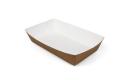 Bruin/wit kartonnen snackbakje geschikt voor het serveren van o.a. frites of snacks.