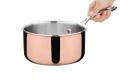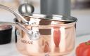 Deze hoge kwaliteit, koperen sauspan van Vogue heeft een kern van aluminium, een binnenzijde van RVS en een buitenlaag van koper. Met geklonken, koelblijvend handvat. De Triwall constructie zorgt voor een gelijkmatige warmteverdeling zonder hotspots, wat resulteert in uitstekende, consistente bereidingen. Geborstelde binnenzijde met een aantrekkelijke, slijtvaste en spiegel gepolijst koperen buitenzijde.