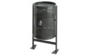 Ronde, gedeeltelijk geperforeerde afvalbak van metaal op statief. De bak kan geleegd worden door het losdraaien van de sluitschroef, de bak is dan kantelbaar. Deze buiten afvalbak houd uw terras of horeca buitengelegenheid schoon en opgeruimd.