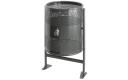 Ronde, gedeeltelijk geperforeerde afvalbak van metaal op statief. De bak kan geleegd worden door het losdraaien van de sluitschroef, de bak is dan kantelbaar. Deze buiten afvalbak houd uw terras of horeca buitengelegenheid schoon en opgeruimd.